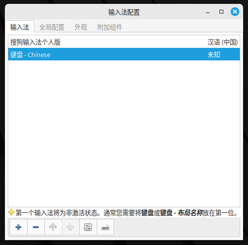 sudo dpkg -i sogoupinyin_4.2.1.145_amd64.deb前往输入法配置选择添加搜狗输入法