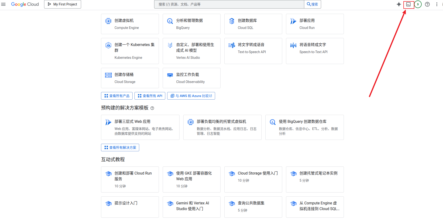 首先进入谷歌云控制台,点击下图按钮激活Cloud Shell