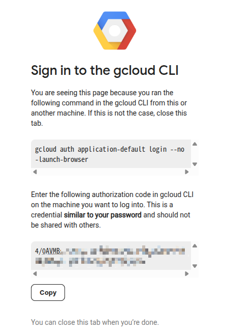 gcloud auth application-default loginDo you want to continue (Y/n)?输入y此时会给你一个链接,点击链接跳转到确认页面,选择账号后并继续后,会跳到验证码页面,复制验证码并填入Cloud Shell中